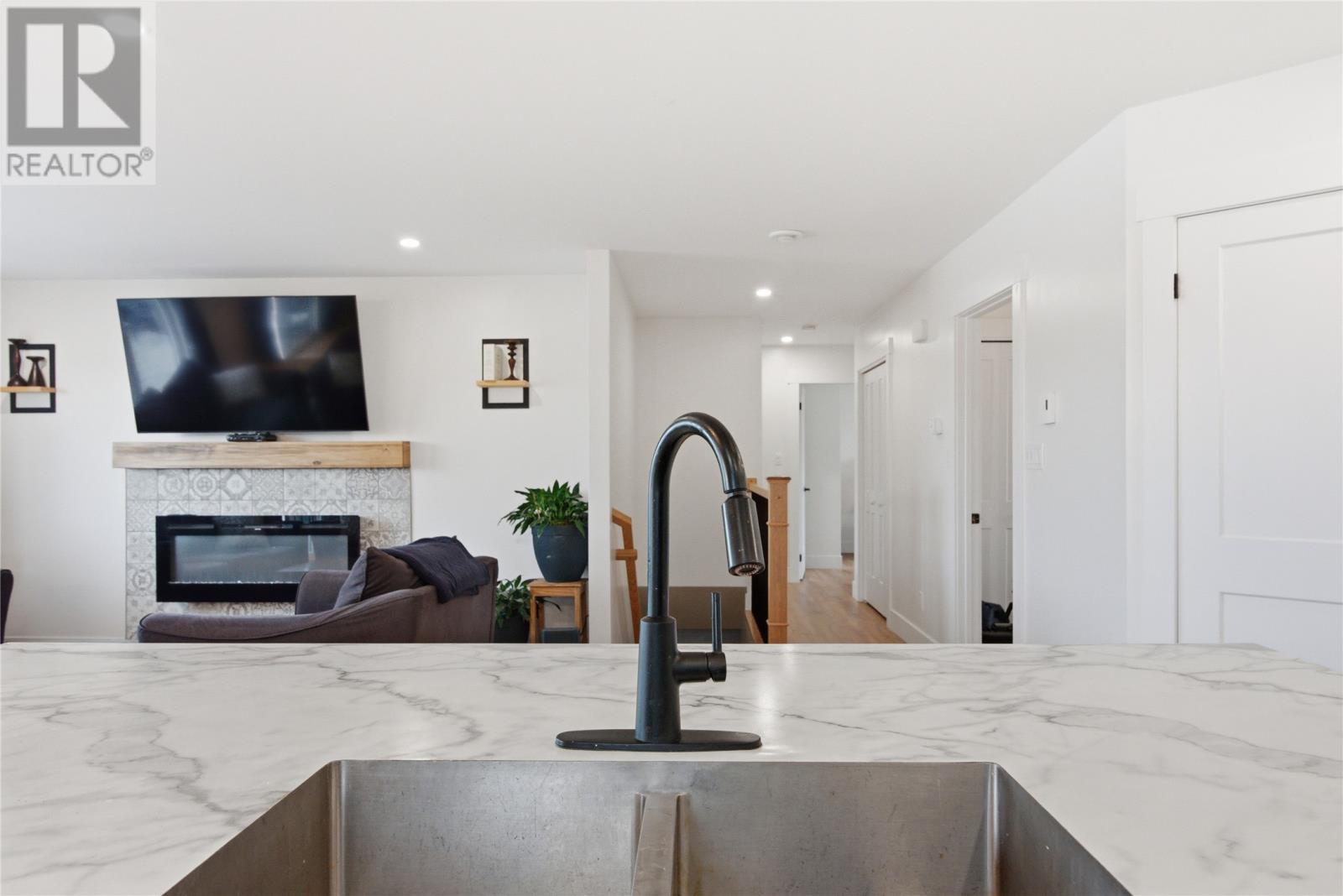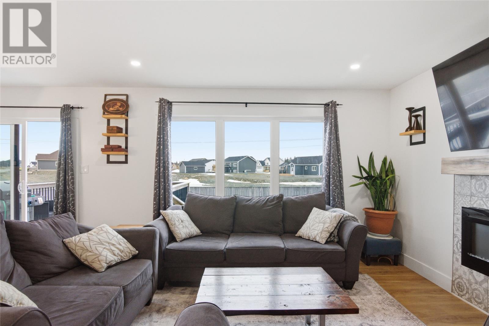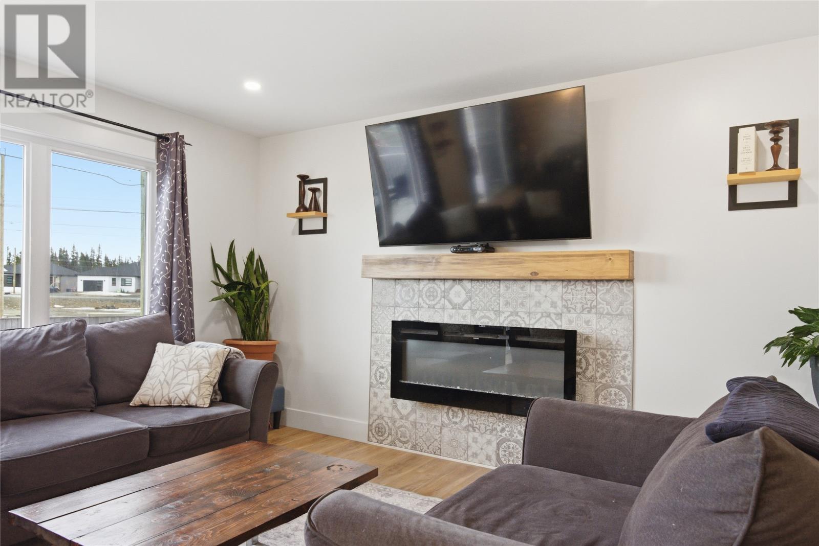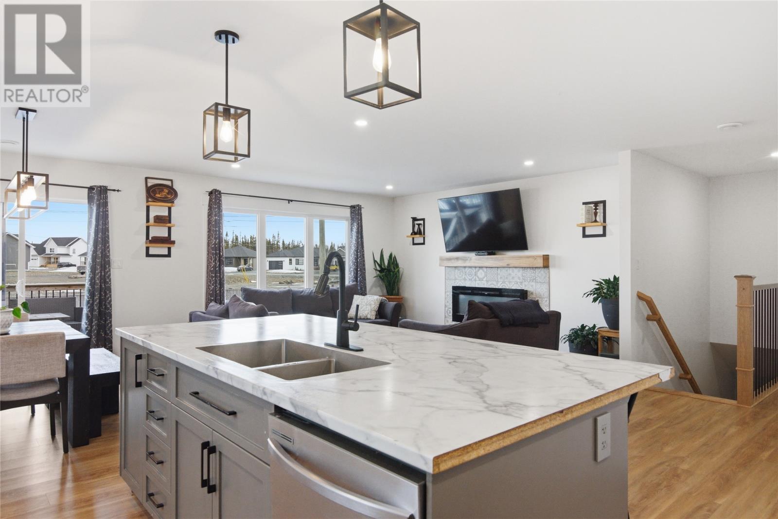 144 Penwell Avenue, Gander — 2023-built bungalow offering approximately 2,900 sq ft of finished living space on two levels in one of Gander’s most sought-after new subdivisions. The main floor features a bright, open-concept layout with luxury vinyl plank flooring and oversized windows throughout. The designer kitchen is the centrepiece — white shaker cabinetry, a large island with marble-look countertops and seating for four, subway tile backsplash accented by decorative tile behind the range, stainless steel appliances including a french-door fridge, and a walk-in pantry. The kitchen flows into a dining area with patio door access to the rear deck, and a spacious living room anchored by a tiled electric fireplace with reclaimed wood mantel. Three bedrooms on the main level include a primary suite with walk-in closet, 4-piece ensuite, and private balcony. A second full 4-piece bathroom and a foyer with closet complete the main floor. Attached garage with inside entry. The fully developed lower level adds two additional bedrooms, a third full bathroom, a large rec room, a dedicated home gym, a separate laundry room, and ample storage. Large above-grade windows keep the basement bright and functional. Comfort features include a ductless mini-split heat pump for efficient heating and cooling, electric baseboard heating, HRV system for fresh-air circulation, and modern matte black fixtures and designer lighting throughout. Exterior highlights: paved driveway, fully fenced rear yard, rear deck with room for outdoor dining, primary bedroom balcony, and mature neighbourhood amenities nearby. Balance of the 7-year Atlantic Home Warranty transferable to the new owner. A turn-key home built to current standards with thoughtful finishes throughout. As per Seller’s Direction, no offers will be presented until April 27 at 11AM – please leave all offers open for acceptance until 1PM the same day. (id:2887)