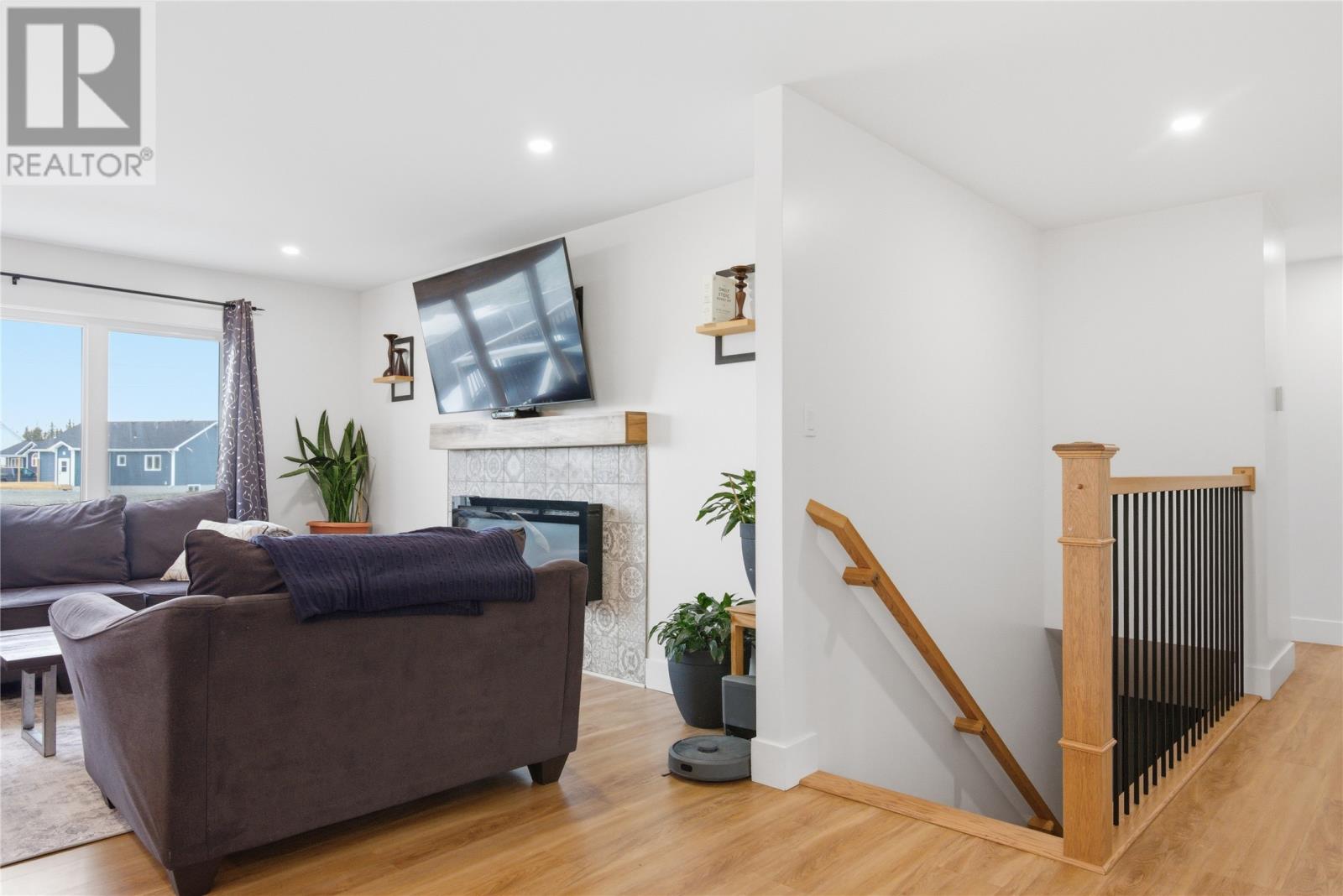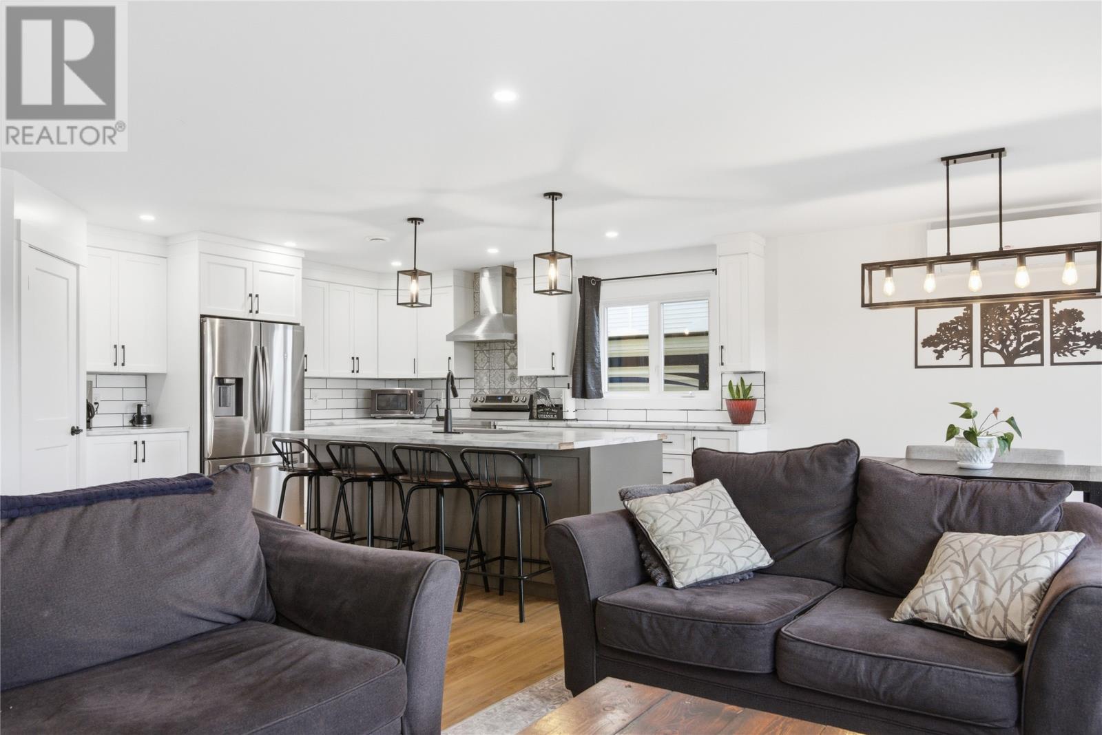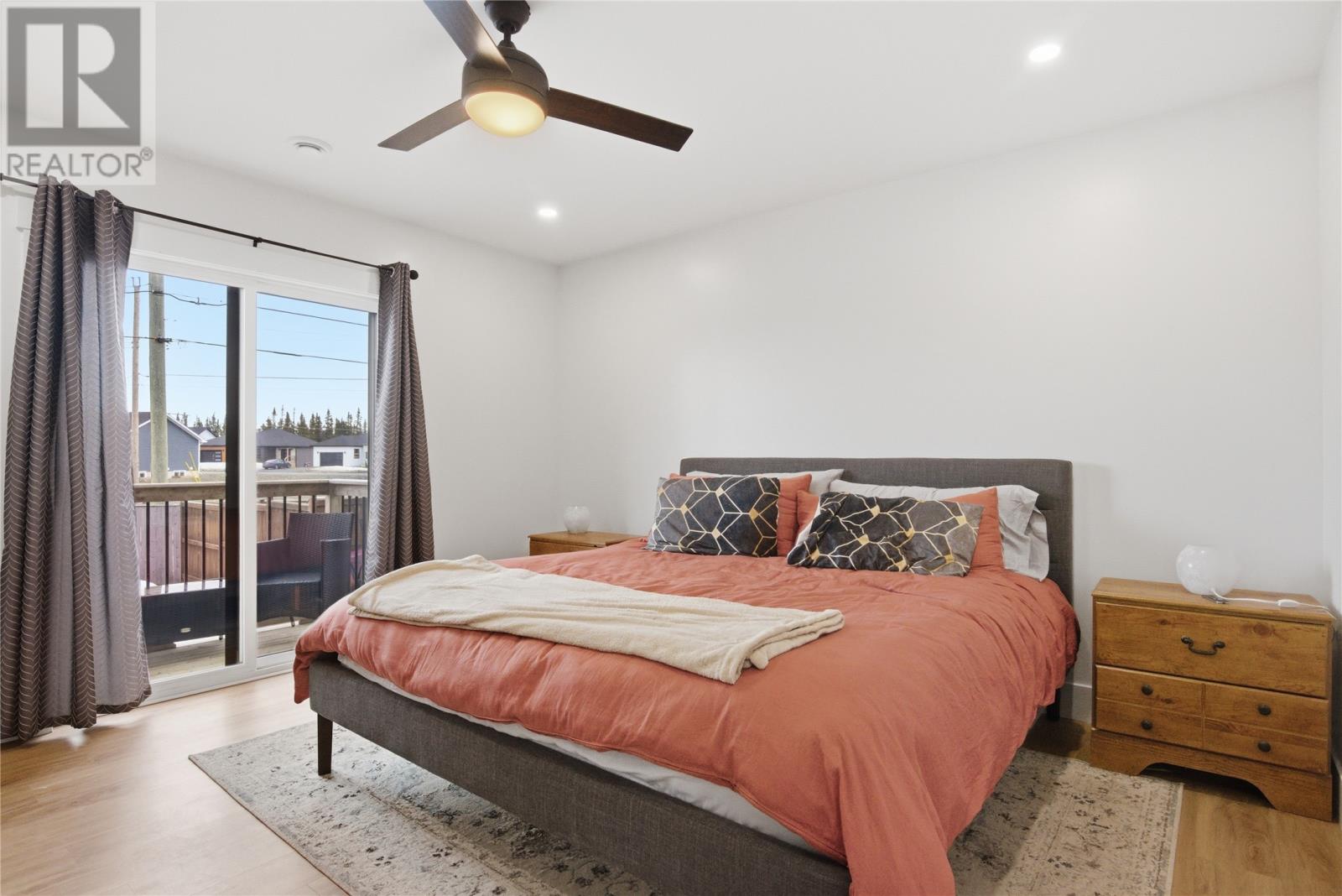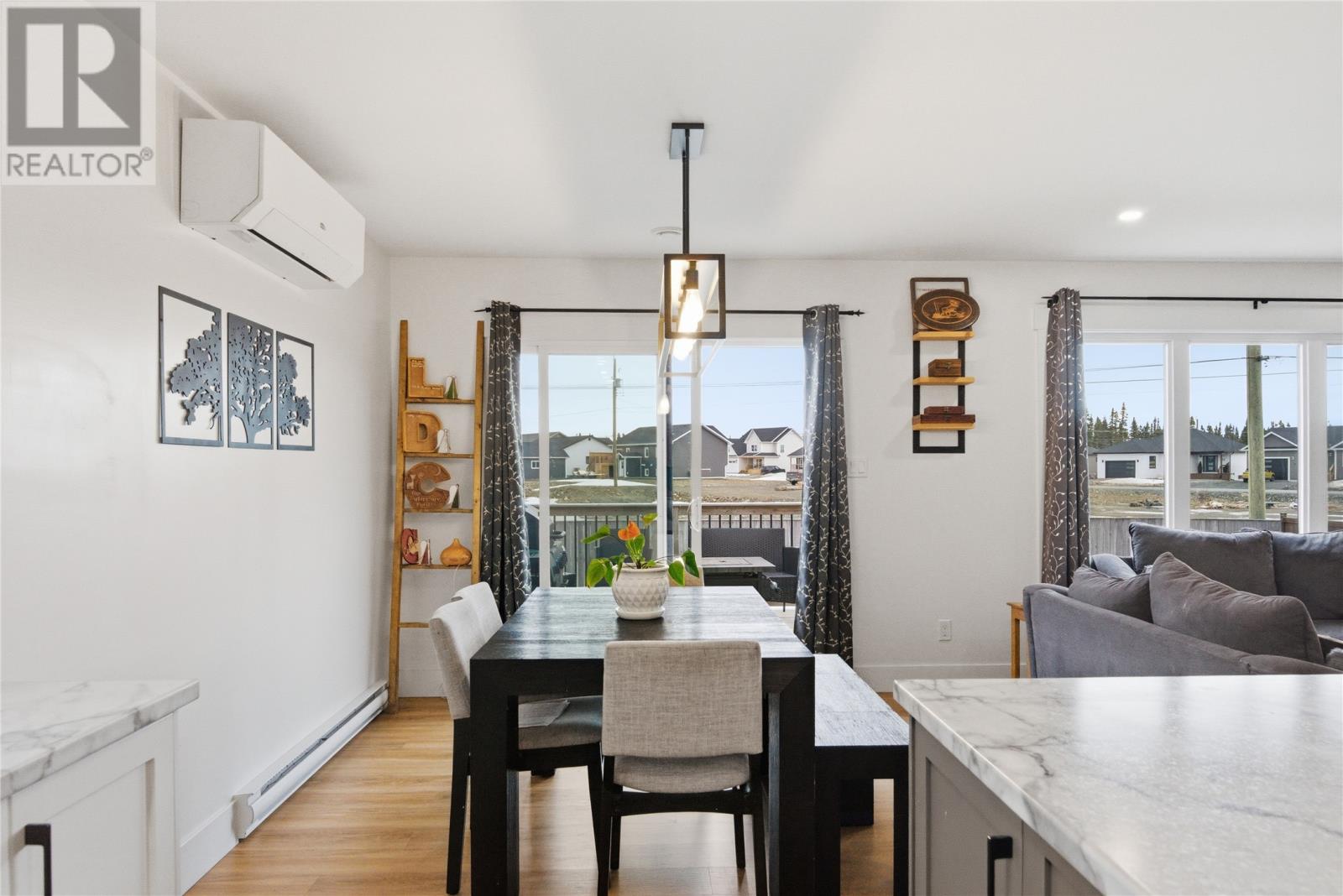 144 Penwell Avenue, Gander — 2023-built bungalow offering approximately 2,900 sq ft of finished living space on two levels in one of Gander’s most sought-after new subdivisions. The main floor features a bright, open-concept layout with luxury vinyl plank flooring and oversized windows throughout. The designer kitchen is the centrepiece — white shaker cabinetry, a large island with marble-look countertops and seating for four, subway tile backsplash accented by decorative tile behind the range, stainless steel appliances including a french-door fridge, and a walk-in pantry. The kitchen flows into a dining area with patio door access to the rear deck, and a spacious living room anchored by a tiled electric fireplace with reclaimed wood mantel. Three bedrooms on the main level include a primary suite with walk-in closet, 4-piece ensuite, and private balcony. A second full 4-piece bathroom and a foyer with closet complete the main floor. Attached garage with inside entry. The fully developed lower level adds two additional bedrooms, a third full bathroom, a large rec room, a dedicated home gym, a separate laundry room, and ample storage. Large above-grade windows keep the basement bright and functional. Comfort features include a ductless mini-split heat pump for efficient heating and cooling, electric baseboard heating, HRV system for fresh-air circulation, and modern matte black fixtures and designer lighting throughout. Exterior highlights: paved driveway, fully fenced rear yard, rear deck with room for outdoor dining, primary bedroom balcony, and mature neighbourhood amenities nearby. Balance of the 7-year Atlantic Home Warranty transferable to the new owner. A turn-key home built to current standards with thoughtful finishes throughout. As per Seller’s Direction, no offers will be presented until April 27 at 11AM – please leave all offers open for acceptance until 1PM the same day. (id:2887)