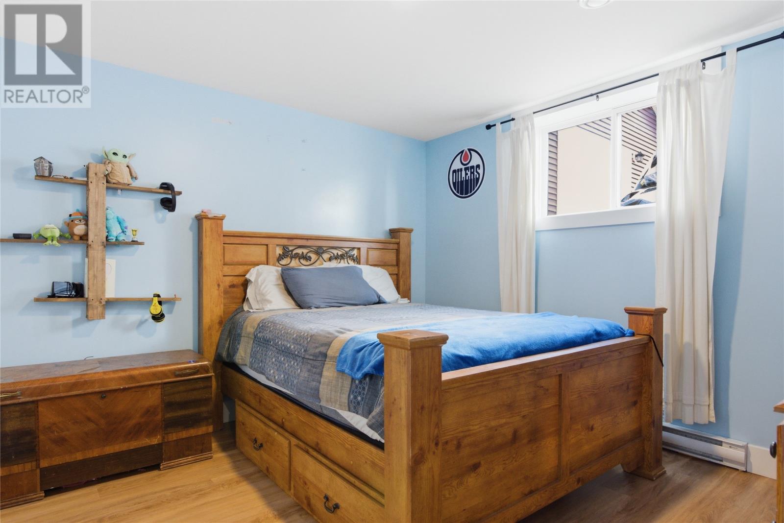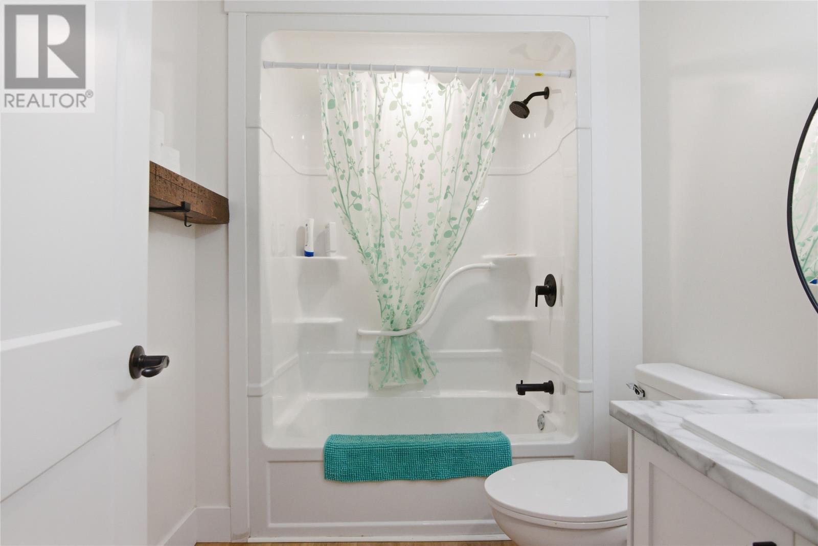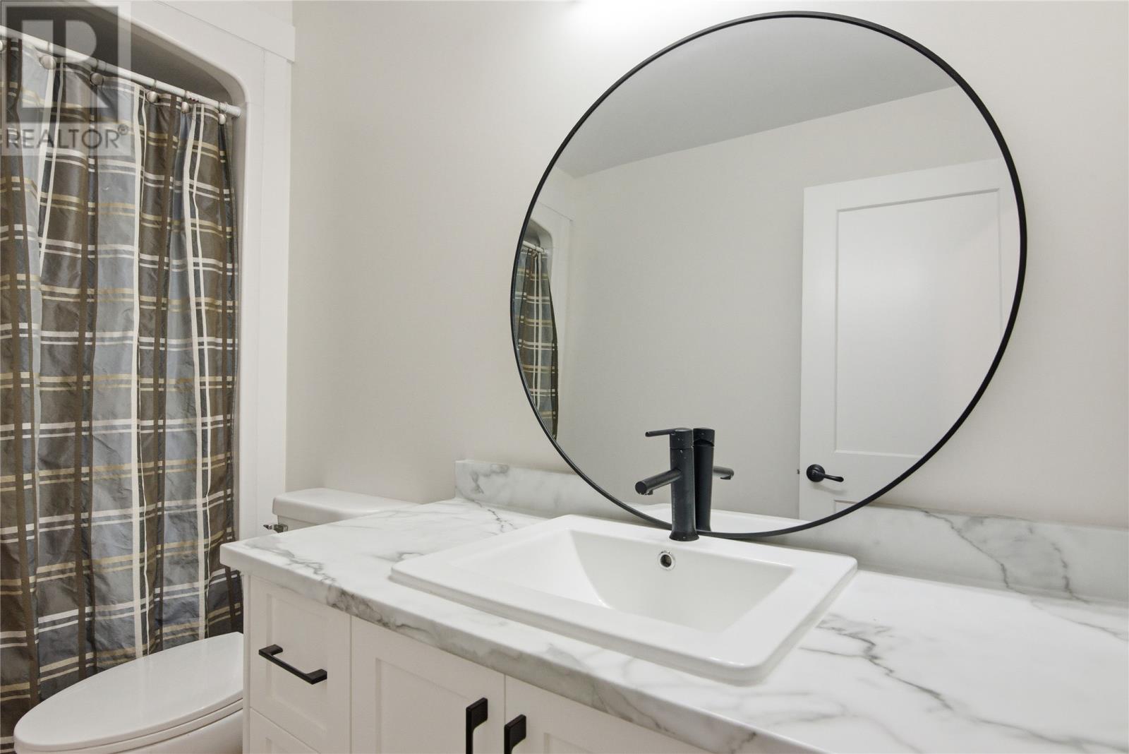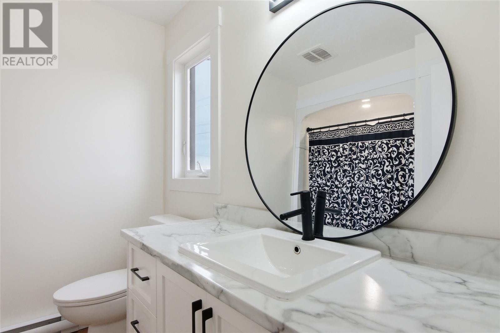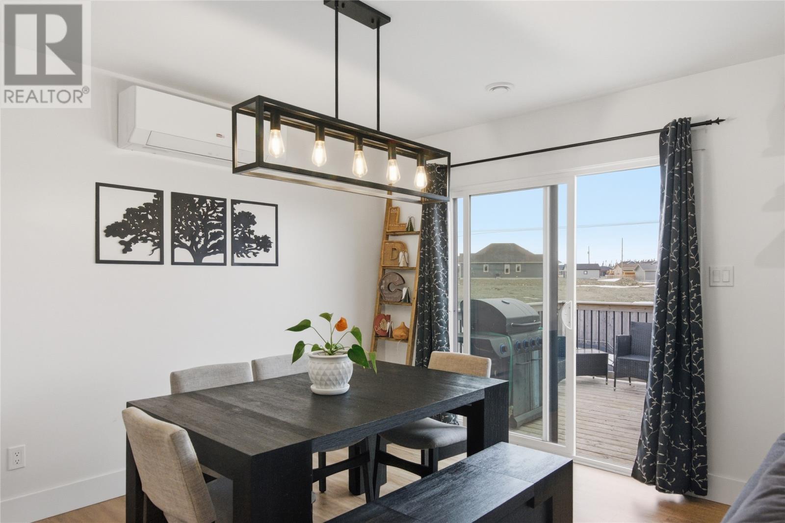 144 Penwell Avenue, Gander — 2023-built bungalow offering approximately 2,900 sq ft of finished living space on two levels in one of Gander’s most sought-after new subdivisions. The main floor features a bright, open-concept layout with luxury vinyl plank flooring and oversized windows throughout. The designer kitchen is the centrepiece — white shaker cabinetry, a large island with marble-look countertops and seating for four, subway tile backsplash accented by decorative tile behind the range, stainless steel appliances including a french-door fridge, and a walk-in pantry. The kitchen flows into a dining area with patio door access to the rear deck, and a spacious living room anchored by a tiled electric fireplace with reclaimed wood mantel. Three bedrooms on the main level include a primary suite with walk-in closet, 4-piece ensuite, and private balcony. A second full 4-piece bathroom and a foyer with closet complete the main floor. Attached garage with inside entry. The fully developed lower level adds two additional bedrooms, a third full bathroom, a large rec room, a dedicated home gym, a separate laundry room, and ample storage. Large above-grade windows keep the basement bright and functional. Comfort features include a ductless mini-split heat pump for efficient heating and cooling, electric baseboard heating, HRV system for fresh-air circulation, and modern matte black fixtures and designer lighting throughout. Exterior highlights: paved driveway, fully fenced rear yard, rear deck with room for outdoor dining, primary bedroom balcony, and mature neighbourhood amenities nearby. Balance of the 7-year Atlantic Home Warranty transferable to the new owner. A turn-key home built to current standards with thoughtful finishes throughout. As per Seller’s Direction, no offers will be presented until April 27 at 11AM – please leave all offers open for acceptance until 1PM the same day. (id:2887)